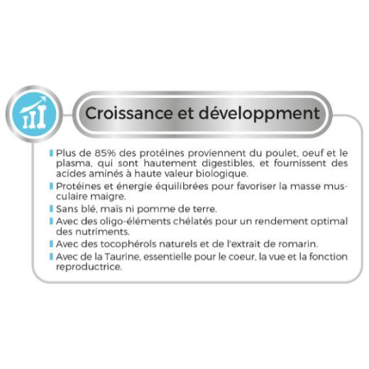Viande de poulet déshydraté (40%), riz, graisse de poulet, œuf déshydraté, protéine végétale, poulet hydrolysé, plasma, extraits de levure, extrait de malt, minéraux, fibre de pois, manno-oligosaccharides (MOS) prébiotiques.